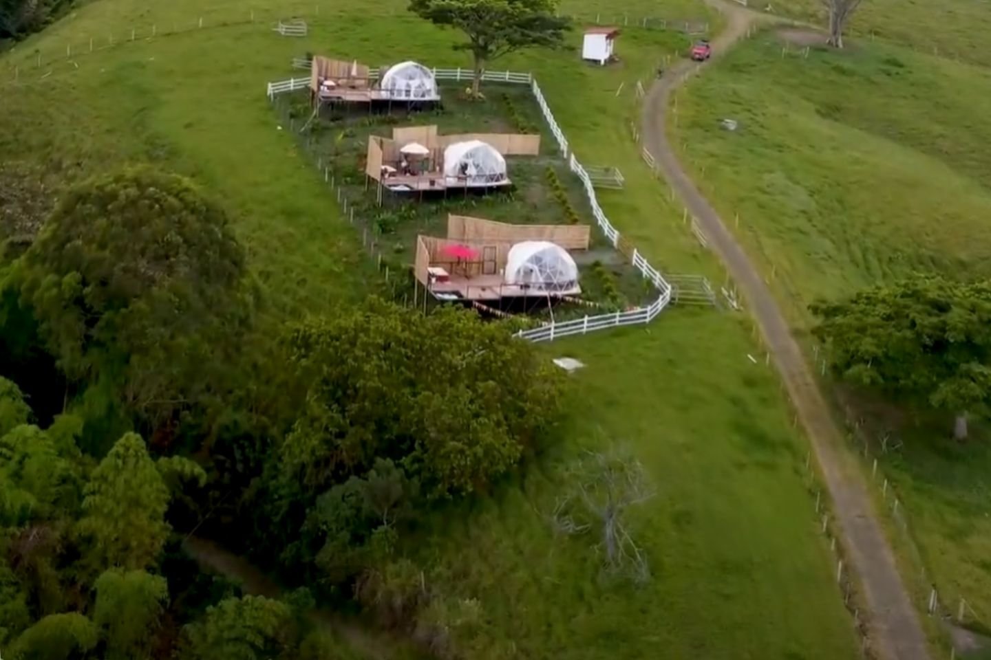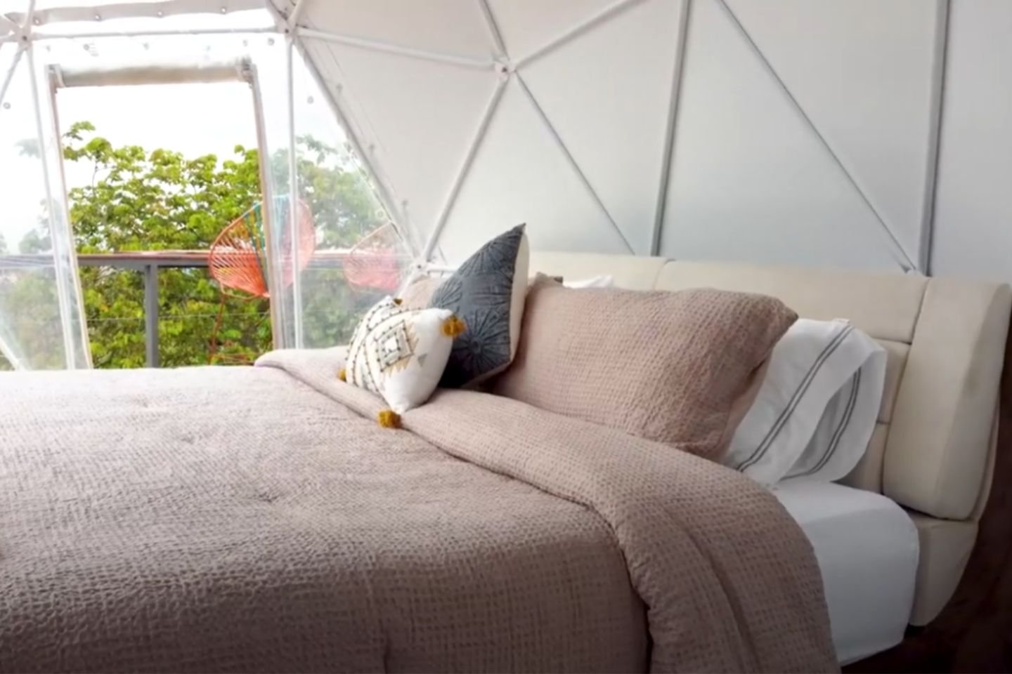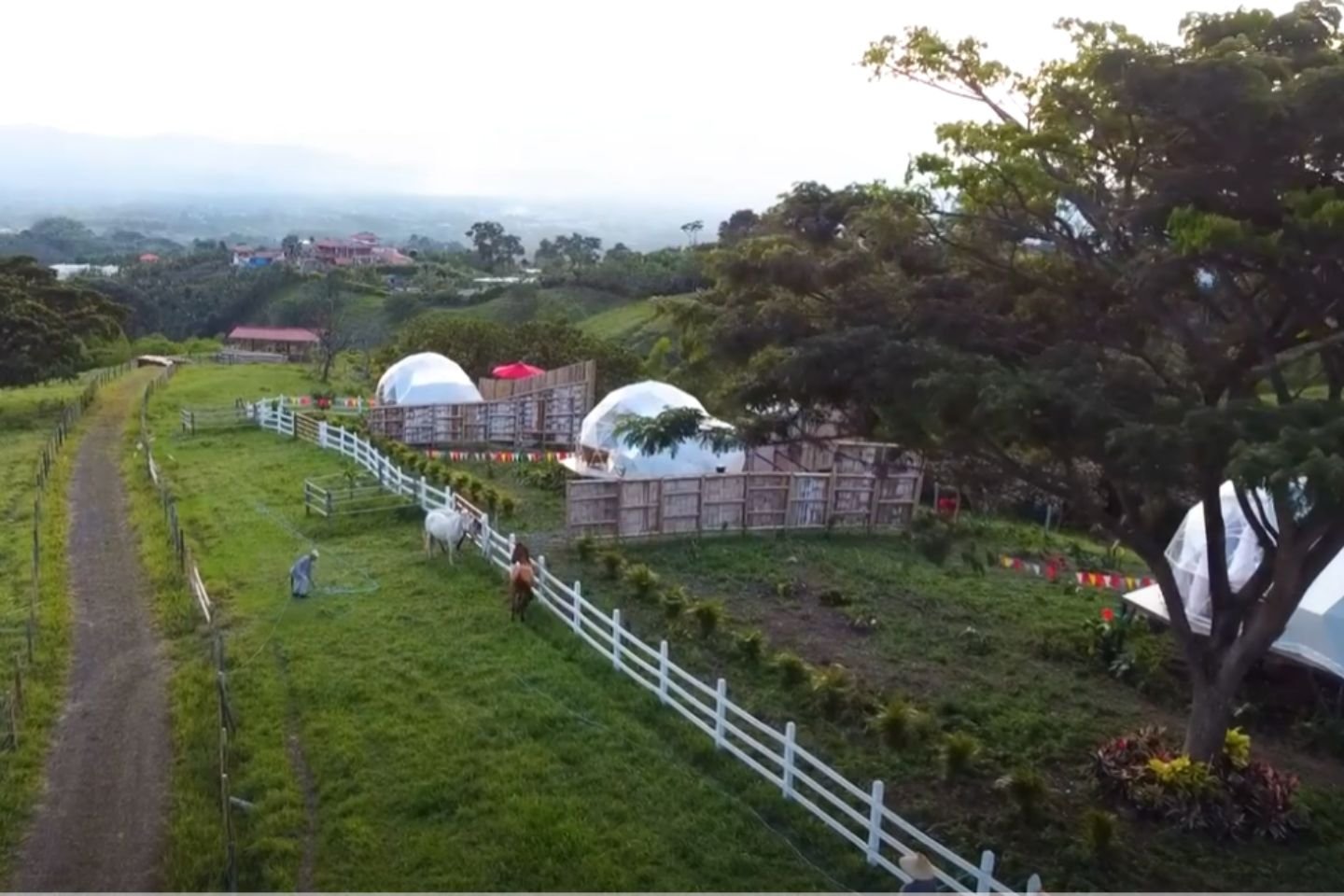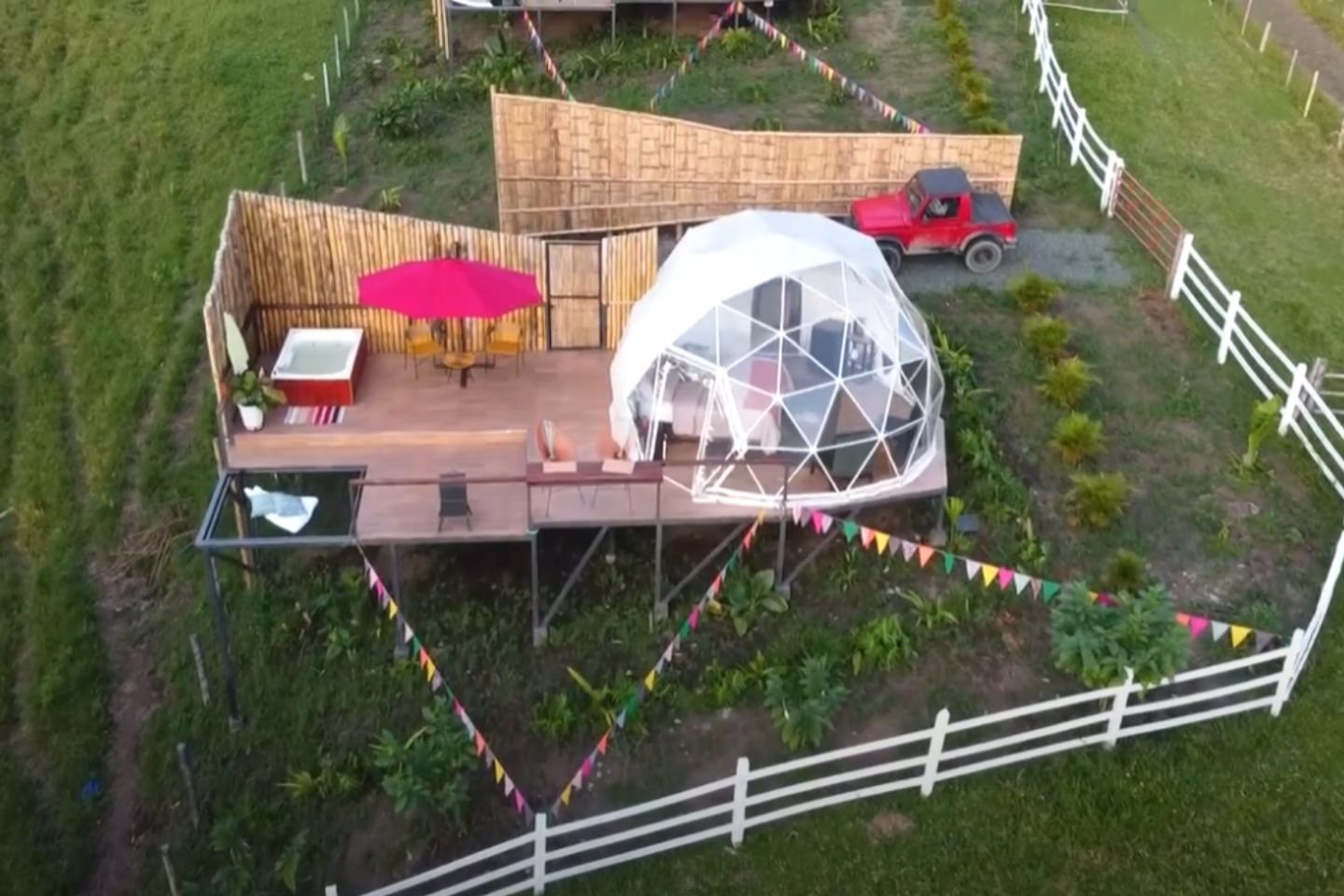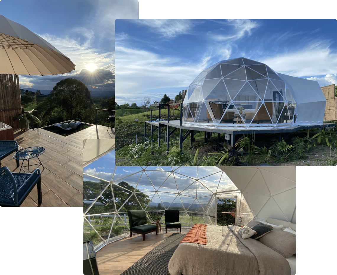 Te ofrecemos un domo equipado con cama gigante, lencería de lujo, cómodas almohadas y cojines; tapetes, sillas, sillones, toallas, agua caliente, jacuzzi, catamarán, cafetera y café, aire acondicionado, nevera, horno para asados a la parrilla o barril (preparara la cena al carbón, mientras disfrutas de la noche y el jacuzzi en la mejor compañía…), parqueadero privado, llega en tu vehículo hasta la puerta del domo.
